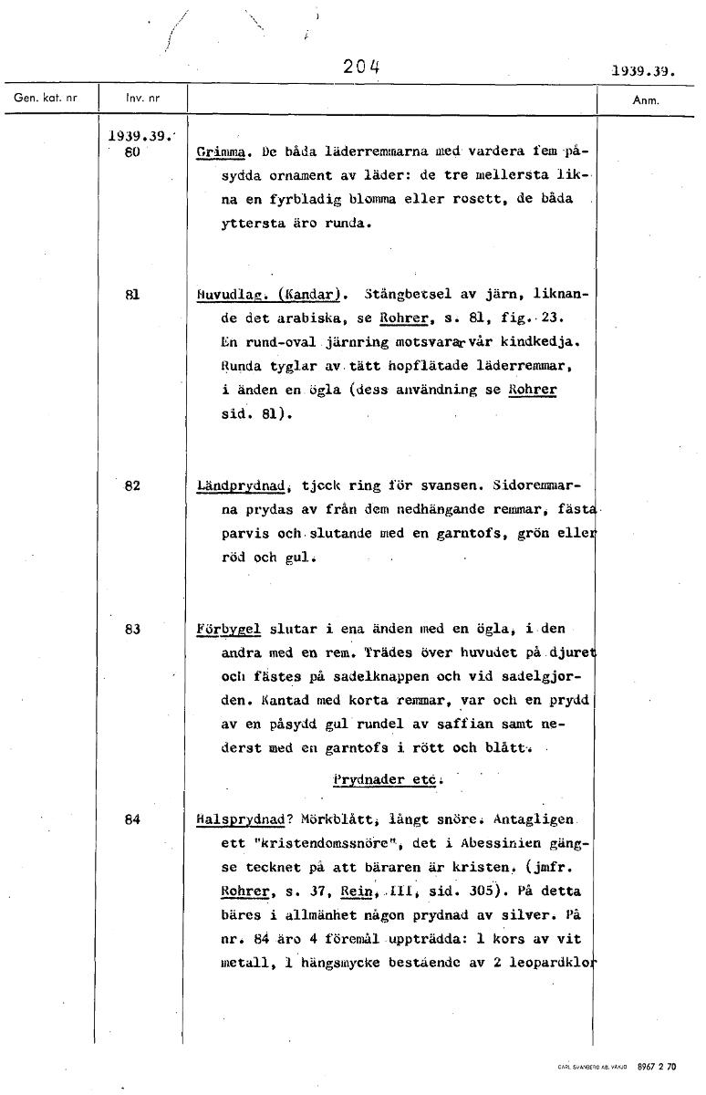 204 1939.39. 1939.394' 80 Grimma. De båda läderremmarna med vardera fem på- sydda ornament av läder: de tre mellersta lik- na en fyrbiadig blomma eller rosett, de båda yttersta äro runda. Huvudlag. (Kandar). Stångbetsel av järn, liknan- de det arabiska, se Rohrer, s. 81, fig., 23. En rund-oval järnring motsvararvår kindkedja. Runda tyglar av. tätt hopflätade läderremmar, i änden en ögla (dess användning se Rohrer sid. 81). 82 Ländprydnad, tjeck ring för svansen. Sidoremmar- na prydas av från dem nedhängande remmar, fäst parvis och, slutande med en garntofs, grön elle röd och gul. 83 Förbygel slutar i ena änden med en ögla, i den andra med en rem. Trädes över huvudet på djure och fästes på sadelknappen och vid sadelgjor- den. Kantad med korta remmar, var och en prydd av en påsydd gul rundel av saffian samt ne- derst med en garntofs i rött och blått-. Prydnader etc. 84 Halsprydnad? Mörkblått; långt snöre. Antagligen. ett "kristendomssnöre", det i Abessinien gäng- se tecknet på att bäraren är kristen. (jmfr. Rohrer, s. 37, Rein,,111, sid. 305). På detta bäres i allmänhet någon prydnad av silver. På nr. 84 äro 4 föremål uppträdda: 1 kors av vit metall, 1 hängsmycke bestående av 2 leopardklo [ocr]