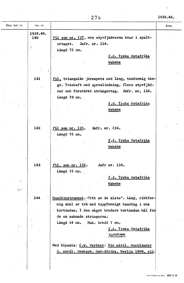 274 1939.48. 193M8. 140 Pil som nr. 127, men styrfjädrarna kvar i spalt- uttaget. Jmfr. nr. 124. Längd 75 cm. f.d. Tyska Ostafrika Wahehe. 141 Pil, triangulär järnspets med lång, tenformig tån- ge. Tr...
