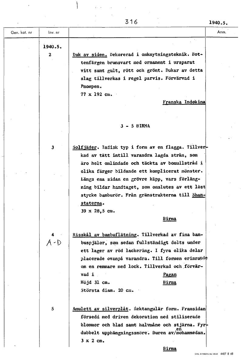 316 1940.5. 1940.5. 2 Duk av siden. Dekorerad i omknytningsteknik. Bot- tenfärgen brunsvart med ornament i ursparat vitt samt gult, rött och grönt. Dukar av detta slag tillverkas i regel parvis. Förvärvad i Pnompen. 77 x 192 cm. Franska Indokina 3 - 5 BIRMA 3 Solfjäder. Indisk typ i form av en flagga. Tillve kad av tätt intill varandra lagda strån, som äro helt omlindade och täckta av bomullstråd i olika färger bildande ett komplicerat mönster. Längs ena sidan en grövre käpp, vars förläng- ning bildar handtaget, som omslutes av ett löst stycke bamburör. Från gränstrakterna till Shan- staterna. 39 x 28,5 cm. Birma Risskål av bambuflätning. Tillverkad av fina bam- buspjälor, som sedan fullständigt dolts under ett lager av röd lackering. I fyra olika delar placerade ovanpå varandra. Till formen erinrand om en remmare med lock. Tillverkad och förvär- vad i Paran Höjd 31 cm. Birma Största diam. 20 cm. 5 Amulett av silverplåt. rektangulär form. Framsidan försedd med driven dekoration med stiliserade blommor och blad samt halvmåne och stjärna. Fyr en dubbelt upphängningssnöre Buren av/mohammedan. 3 x 2 cm. Birma [ocr]Stäng