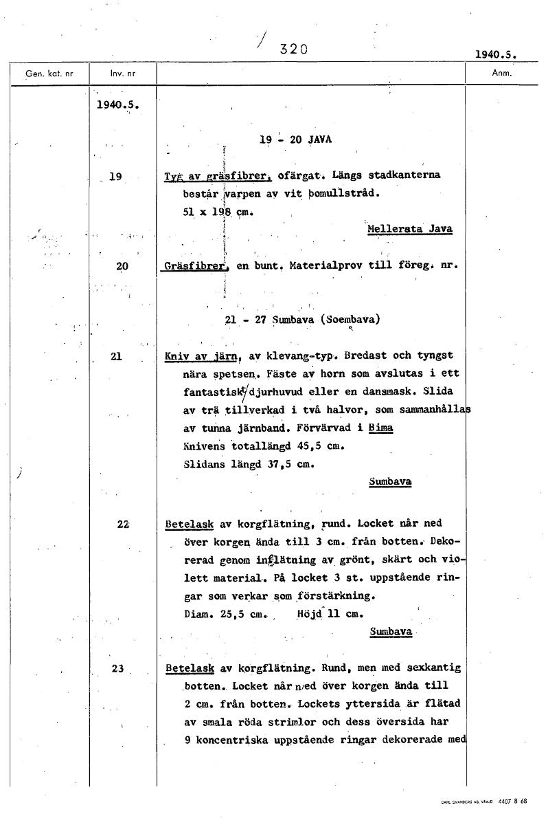 / 320 1940.5. 1940.5. 19 20 JAVA 19 TIM av rasfibrer, ofärgat. Längs stadkanterna består varpen av vit bomullstråd. 51 x 1913 ' cm. Mellerata Java 20 Gräsfibrer, en bunt. Materialprov till föreg. 21 -...