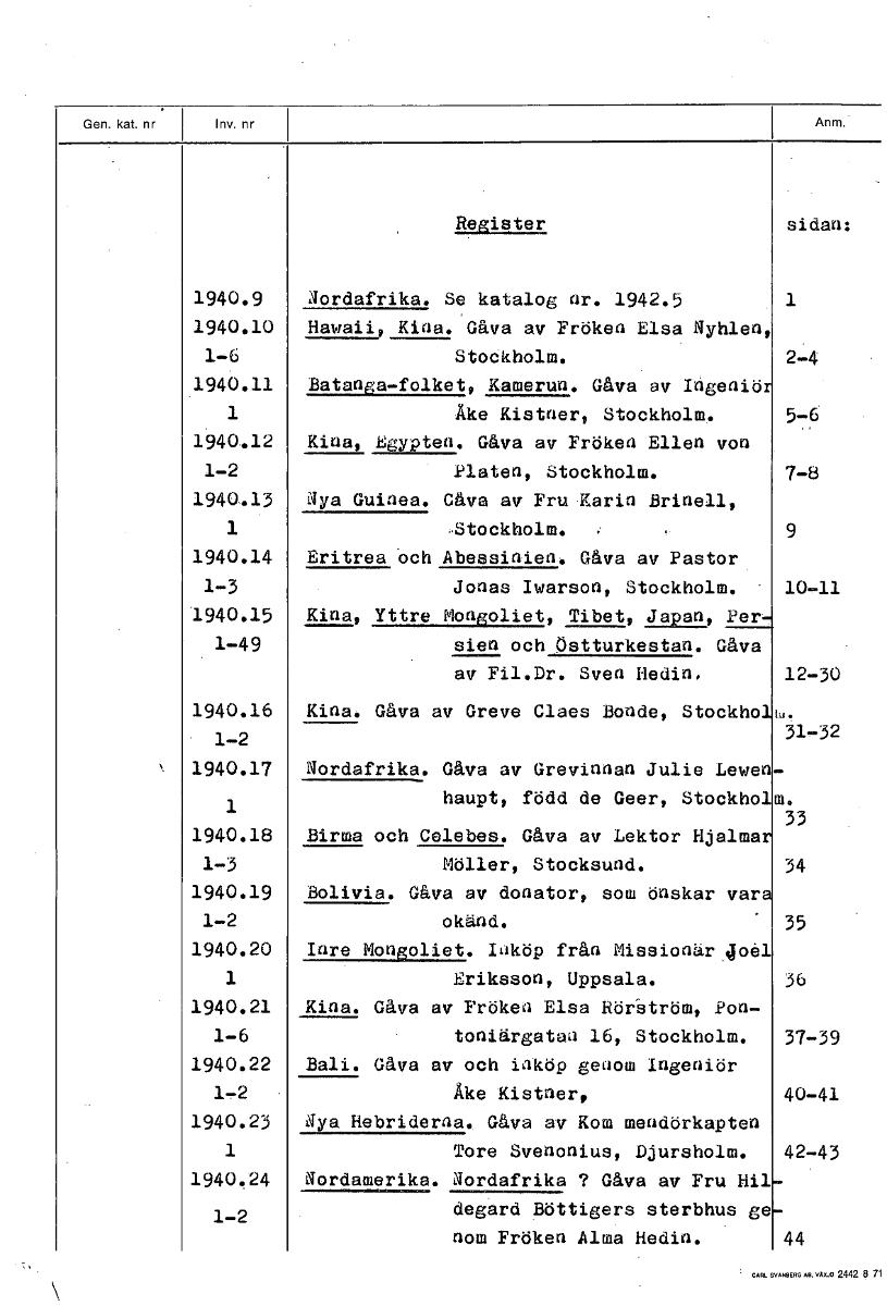 Register sidan: 1940.9 Nordafrika. Se katalog nr. 1942.5 1940.10 Hawaii, Kina. Gåva av Fröken Elsa Nyhlen, 1-6 Stockholm. 2-4 1940.11 Batanga—folket, Kamerun. Gåva av Ingenjör 1 Åke Kistner, Stockholm. 5-6 1940.12 Kina, Egypten. Gåva av Fröken Ellen von 1-2 Platan, Stockholm. 7-8 1940.13 Nya Guinea. Gåva av Fru Karin Brinell, 1 Stockholm. 9 1940.14 Eritrea och Abessinien. Gåva av Pastor 1-3 Jonas Iwarson, Stockholm. 10-11 1940.15 Kina, Yttre Mongoliet, Tibet, Japan, Per 1-49 sien och östturkestan. Gåva av Fil.Dr. Sven Hedin, 12-30 1940.16 Kina. Gåva av Greve Claes Bonde, Stockho 1-2 31-32 1940.17 Nordafrika. Gåva av Grevinnan Julie Lewen 1 haupt, född de Geer, Stockho m. 33 1940.18 Birma och Celebes. Gåva av Lektor Hjalma 1-3 Möller, Stocksund. 34 1940.19 Bolivia. Gåva av donator, som önskar var 1-2 okänd. 35 1940.20 Inre Mongoliet. Inköp från Missionär.joel 1 Eriksson, Uppsala. 36 1940.21 Kina. Gåva av Fröken Elsa Rör-ström, Pon- 1-6 toniärgatan 16, Stockholm. 37-39 1940.22 Bali. Gåva av och inköp genom Ingenjör 1-2 Åke Kistner, 40-41 1940.23 aya Hebriderna. Gåva av Kom mendörkapten 1 Tore Svenonius, Djursholm. 42-43 1940.24 Nordamerika. Nordafrika ? Gåva av Fru Hil 1-2 degard Böttigers sterbhus ge nom Fröken Alma Hedin. 44 [ocr]