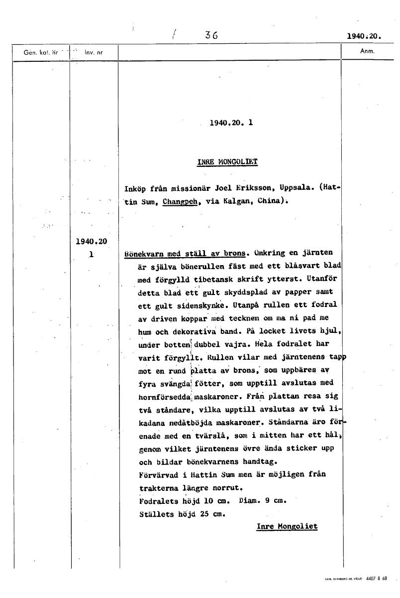 3 6 1940:20. 1940.20. 1 INRE MONGOLIET Inköp från missionär Joel Eriksson, Uppsala. (Hat- tin Sum Changpeh, via Kalgan, China). 1940.20 1 bönekvarn med ställ av brons. Omkring en järnten är själva bön...