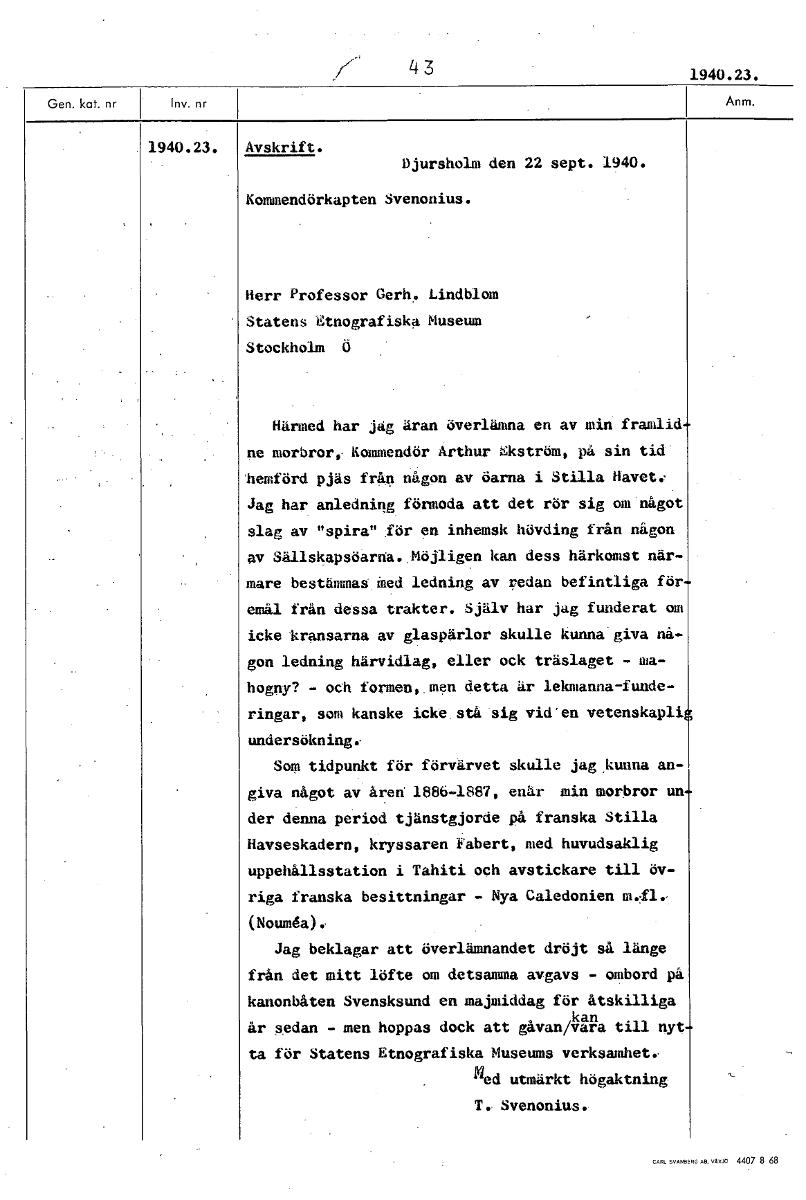 43 1940.23. 1940.23. Avskrift. Djursholm den 22 sept. 1940. Kommendörkapten Svenonius. Herr Professor Cerh. Lindblom Statens etnografiska Museum Stockholm Ö Härmed har jag äran överlämna en av min fra...