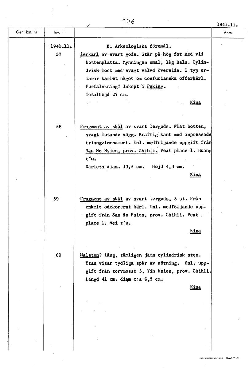 106 1941.11. 1941:11: B. Arkeologiska föremål. 57 Lerkärl av,svart gods. Står pkhög fot med vid bottenplatta. Mynningen smal, låg hals. Cylin- driskt lock med svagt välvd översida. I typ er- inrar kärlet något om confucianska offerkärl. Förfalskning? Inköpt i Peking. Totalhöjd 27 cm. Kina 58 Fragment av skål av.svart lergods. Flat botten, svagt lutande vägg. Kraftig kant med inpressade triangelornament. Enl. medföljande uppgift frå San Ho Hsien, prov. Chihli. Peat place. 1. Huan t'u. Kärlets: diam. 13,5 cm. Höjd 4,3 cm. Kina 59 Fragment av skål av svart lergods, 3 st. Från enkelt odekorerat kärl. Enl. medföljande upp- gift från San Ho Hsien, prov. Chihli. Peat place 1. Hei Kina 60 Malsten? Lång, tämligen jämn cylindrisk sten. Ytan visar tydliga spår av nötning. Enl.. upp- gift från torvmosse 3, Yih Hsien,. prov. Chihli. Längd 41 cm. diqm c:a 6,5 cm. Kina [ocr]
