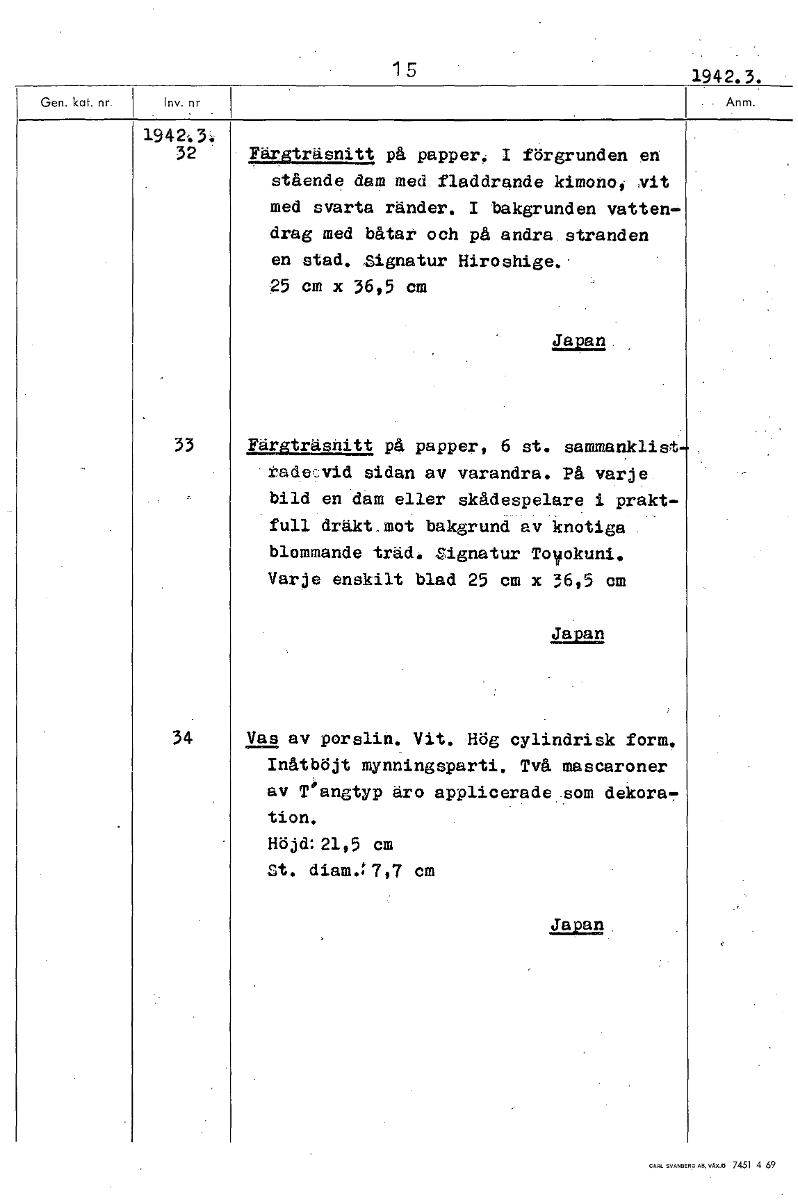 1 5 1942.3. 194213: 32 ' • Färgträsnitt på papper. I förgrunden en' stående dam med fladdrande kimono, vit med svarta ränder. I bakgrunden vatten drag med båtar och på andra. stranden en stad. Signatur Hiroshige.. 25 cm x 36,5 cm Japan 33 Färgträsnitt på papper, 6 st. sammanklist tade_vid sidan av varandra. På varje bild en dam eller skådespelare i prakt- full dräkt mot bakgrund av knotiga blommande träd..vignatur Toyokuni. Varje enskilt blad 25 cm x 36,5 cm Japan 34 Vas av porslin. Vit. Hög cylindrisk form. Inåtböjt mynningsparti. Två mascaroner av T'angtyp äro applicerade som dekora.r tion. Höjd:21,5 cm St. diam.:7,7 cm Japan [ocr]Stäng