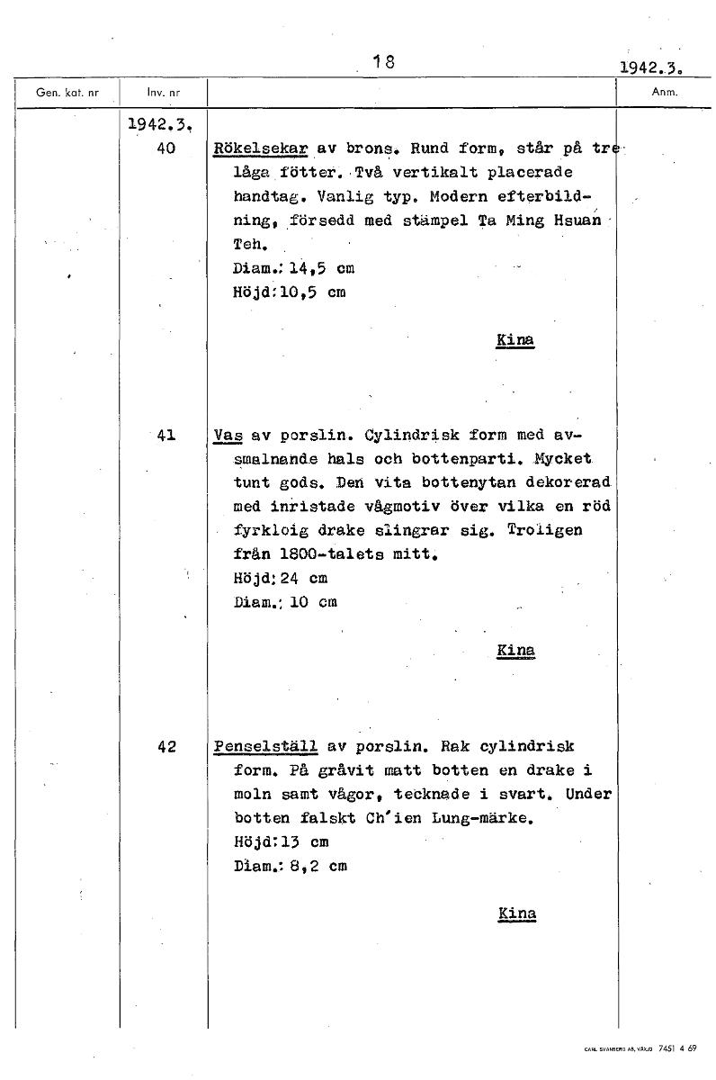 18 1942.3. 1942.3' 40 Rökelsekar av brons. Rund form, står på tr låga fötter.,Två vertikalt placerade handtag. Vanlig typ. Modern efterbild- ning, försedd med stämpel Ta Ming Hsuan Teh. Diam.: 14,5 cm Höjd:10,5 cm Kina 41 Vas av porslin. Cylindrisk form med av- smalnande hals och bottenparti. Mycket tunt gods. Den vita bottenytan dekorerad med inristade vågmotiv över vilka en röd fyrkloig drake slingrar sig. Troligen från 1800-talets mitt, Höjd:24 cm Diam.: 10 cm • Kina —. 42 Penselställ av porslin. Rak cylindrisk form. På gråvit matt botten en drake i moln samt vågor, tecknade i svart. Under botten falskt Ch'ien Lung-märke. Höjd:13 cm Diam.:8 9 2 cm Kina [ocr]