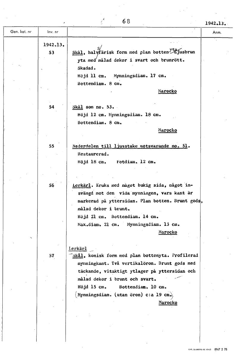 68 1942.13'. 1942.13. 53 Skål, halv årisk form med plan bottensbrun yta med målad dekor i svart och brunrött. Skadad. Nöjd 11 cm. Mynningsdiam. 17 cm. Bottendiam. 8 cm. Marocko 54 Skål som no. 53. Höjd 12 cm. Mynningsdiam. 18 cm. Bottendiam. 8 cm. Marocko 55 Nederdelen till ljusstake motsvarande no. 51. Restaurerad. Höjd 18 cm. Fotdiam. 12 cm. 56 Lerkärl. Kruka med något bukig sida, något in- svängd mot den vida mynningen, vars kant är markerad på yttersidan. Plan botten. Brunt god målad dekor i brunt. Höjd 21 cm. Bottendiam. 14 cm. Max.diam. 21 cm. Mynningsdiam. 13 cm. Marocko Lerkärl 37 Skål, konisk form med plan bottenyta. Profilerad mynningkant. Två vertikalöron. Brunt gods med täckande, vitaktigt ytlager på yttersidan och målad dekor i brunt och svart. Höjd 15 cm. Bottendian. 10 cm. (Mynningsdiam. (utan öron) c:a 19 Marocko [ocr]Stäng