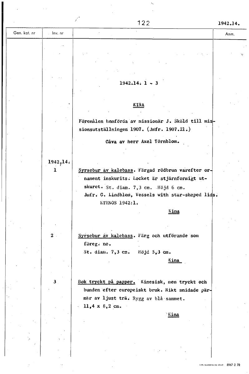 122 1942.14. 1942.14. 1 KINA Föremålen hemförda av missionär J. Sköld till mis sionsutställningen 1907. (JMfr. 1907.21.) Gåva av herr Axel Törnblom. 1942.14., 1 Syrsebur av kalebass. Färgad rödbrun va...