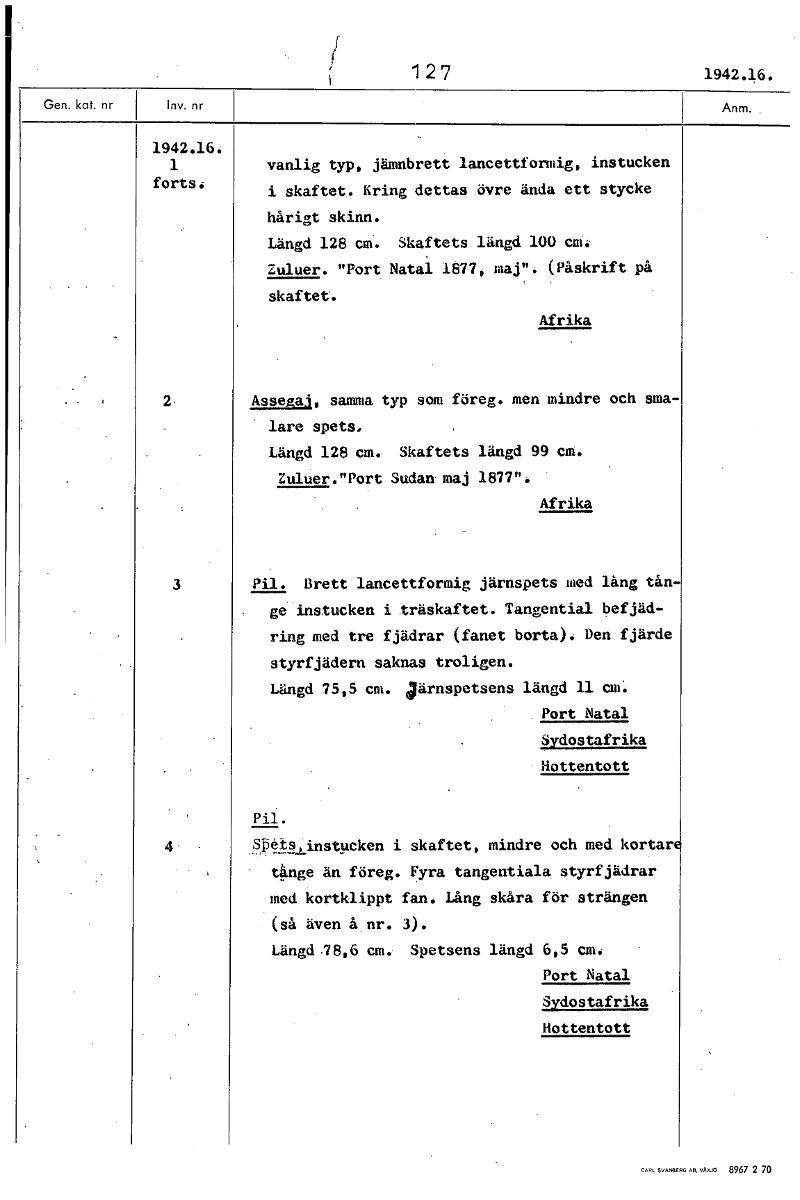 12 7 1942.16. 1942.16. 1 vanlig typ, jämnbrett lancettformig, instucken forts: i skaftet. Kring dettas övre ända ett stycke hårigt skinn. Längd 128 cm. Skaftets längd 100 cm. Zuluer. "Port Natal 1877,...