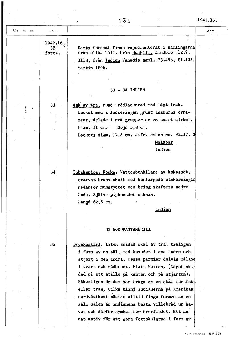 • 135 1942.16. 1942.16, 32✓ Detta föremål finns representerat i samlingarna 32✓forts. från olika håll. Från Suahili, Lindblom 12.7. 1118, från Indien Vanadis saml. 73.456 81.135, Martin 1896. 33 34 INDI... Visa hela