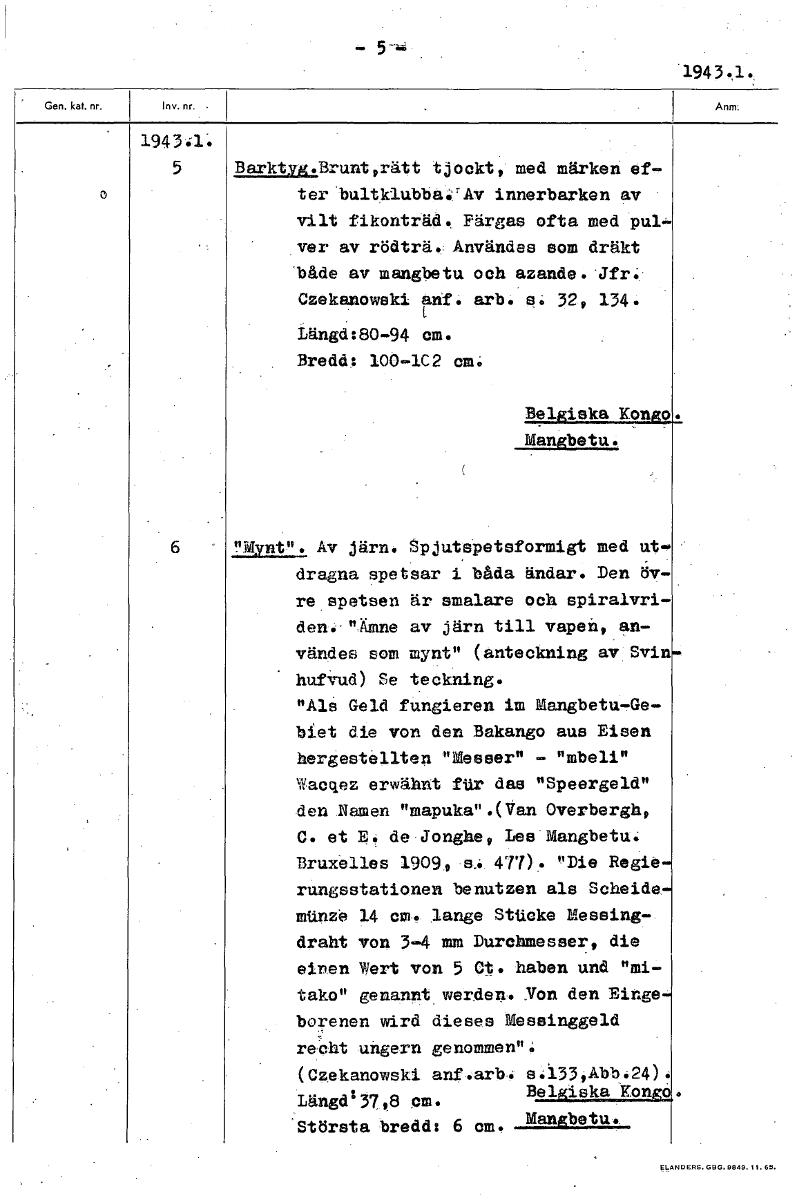 19434.: 19434: 5 Barkt4Brunt9rätt tjockt, med märken ef- ter bultklubba.'Av innerbarken av vilt fikonträd. Färgas ofta med pul- ver av rödträ. Användes som dräkt både av mangbetu och azande. Jfr. Czekanowski anf. arb. s. 32, 134. Längd:80-94 cm. Bredd: 100-1C2 cm. Belgiska Kon o. Mangbetu "Mynt". Av järn. Spjutspetsformigt med ut. dragna spetsar i båda ändar. Den öv- re spetsen är smalare och spiralvri- den. "Ämne av järn till vapeil, an- vändes som mynt" (anteckning av Svin hufvud) Se teckning. "Als Geld fungieren im Mangbetu-Ge- biet die von den Bakango aus Eisen hergestellten "Meseer" "mbeli" Wacqez erwähnt fiir das "Speergeld" den .Namen "mapuka".(Van Overbergh, C. et E. de Jonghe, Lee Mangbetu. Bruxelles 19099 s.. 477). "Die Regie rungsstationen benutzen als Scheide mtinze 14 cm. lange StUcke Messing- draht von 3-4 mm Durchmesser, die eiren Wert von 5 Ct. haben und "mi- tako" genannt werden. Von den Binge barenen wird dieses Messinggeld recht ungern genommen". (Czekanowski anf.arb. s.133,Abb.24). Längd:37,8 Bel iska Kon o. cm. 'Största bredd: 6 cm. 22A812543211 [ocr]