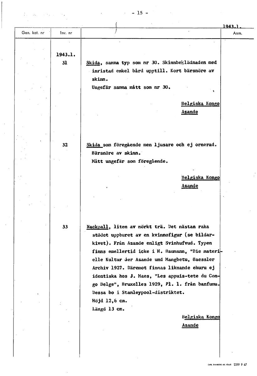 • 1943.1. 31 Skida, samma typ som nr 30. Skinnbeklädnaden med inristad enkel bård upptill. Kort bärsnöre av skinn. Ungefär samma mått som nr 30. Belgiska Kongo Azande 32 Skida som föregående men ljusare... Visa hela