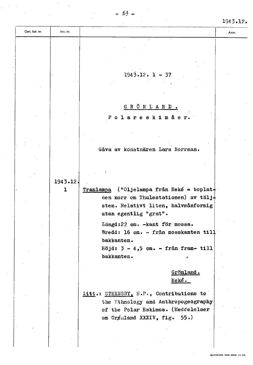 • 194342. 1943.12. 1 - 37 GRÖNLAND. Polareskimåe r. Gåva av konstnären Lars Norrman. 1943.12 1 Tranlampa ("Oljelampa från Nek4 = boplat sen norr om Thulestationen) av tälj sten. Relativt liten, halvmånf... Visa hela