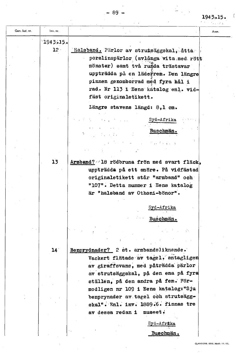 1943..15 1943:45' 12' Halsband. Pärlor av strutsäggskal. åtta porslinspärlor (avlånga 'vita med, röt mönster) samt två ruda trästavar uppträdda på en läderrem. Den längre 4 pinnen genomborrad1m0 fyra hål i rad. Nr 113 i Eens katalog enl. vid fäst originaletikett. Längre stavens längd: 8,1 cm. Syd-Afrika Buschmän. 13 Armband18 rödbruna frön med svart fläck uppträdda på ett snöre. På vidfästad originaletikett står "armband" och "107". Detta nummer i Eens katalog är "halsband av Othoni-bönor". Syd-Afrika Buechmän. 14' Benprydnader? 2 et. armbandsliknande. Vackert flätade-av tagel.' antaglige: av giraffsvans, med påträdda pärlor av strutsäggskal, på den ena på fyr ställen, på den andra på fem. För- modligen nr 109 i Eens katalog:"Sju benprynader av tagel och strutsägg- skal". Enl. inv. 1889:6. finnas tre av dessa redan i museet: Syd-Afrika Buschmän. [ocr]Stäng