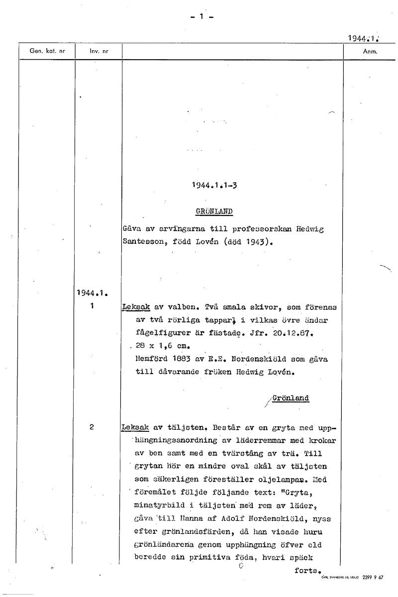1 19441: 1944.1.1-3 GRÖNLAND Gåva av arvingarna till professorskan Hedwig Santesson, född Lovén (död 1943), 1944.1. 1 Leksak av valben. Två smala skivor, som förenas av två rörliga tappar; i vilkas öv...
