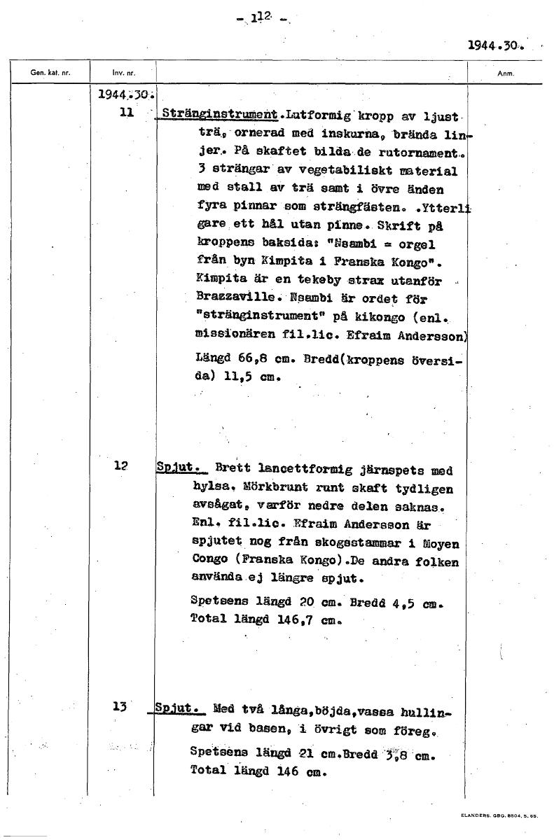 112. - 1944.30. 1944,.30• 11 Stränginstrument.Lutformig'kropp av ljust, trä.9'ornerad med inskurna9 brända lin jer. På skaftet bilda de rutornament.. 3 strängar av vegetabiliskt material med stall av trä samt i övre änden fyra pinnar som strängfästen. .Ytterl: gare ett hål utan pinne. Skrift på kroppens baksida: "lie bl = orgel från byn Rimpita i Franska Kongo". Rimpita är en tekeby strax utanför Brazzaville. Nsambi är ordet för nsträngtestrumentn på kikongo (enl. missionären fil.lic. Efraim Andersson Längd 6698 cm. Breddkroppens översi- d ) 1195 cm. 12 Spjut. Brett lancettformig järnspets med hylsa, Mörkbrunt runt skaft tydligen avsågat, varför nedre delen saknas. Enl. fil.lic. Efraim Andersson är spjutet nog från skogsstammar 1 Moyen Congo (Franska Kongo).De andra folken använda ej längrespjut. Spetsens längd 20 cm. Bredd 4,5 cm. Total längd 146 97 cm. 13 Spjut. Med två långagböjda,vassa hullin- gar vid basen, i övrigt som förege Spetsens längd 21 cm.Bredd ;8 cm. Total längd 146 cm. [ocr]