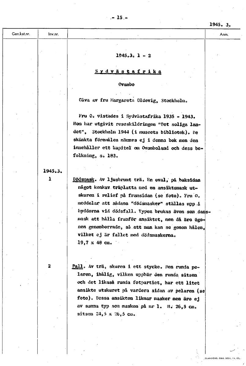 15.- 1945. 3. 1945.3. 1 - 2 Sxdvästafrika Ovambo Gåva av fru Margareta Oldevig, Stockholm. Fru 0. vistades i Sydvästafrika 1935 - 1943. Hon har utgivit reseskildringen "Det soliga lan- det", Stockholm...