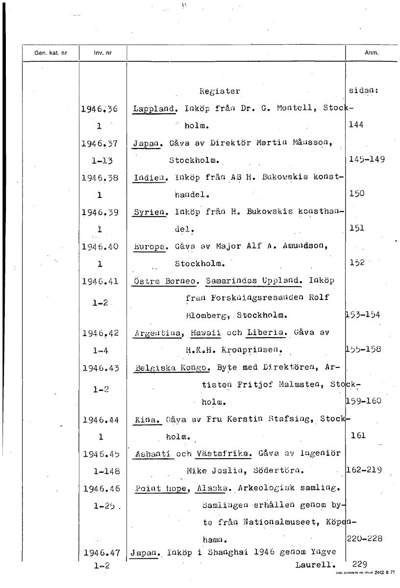 Register sidan: 1946;36 122112112: Inköp från Dr. G. Montell, Stoc - holm. 144 1946.37 Japan. Gåva av Direktör Martin Månsson, 1-13 Stockholm. 145-149. 1946.38 Indien. Inköp från AB H. Bukowskis konst...