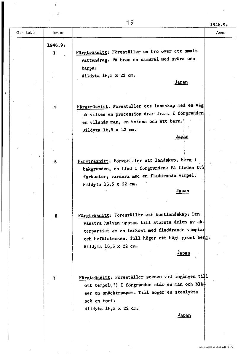 19 1946.9. 194649: 3 Färgträsnitt. Föreställer en bro över ett smalt vattendrag. På bron en samurai med svärd och kappa. Bildyta 16;5 x 22 cm. Japan 4 Färgträsnitt. Föreställer ett landskap med en väg på vilken en procession drar fram. I förgrupden en vilande man, en kvinna och ett barn. Bildyta 16;5 x 22 cm. Japan 5 Färgträsnitt. Föreställer ett landskap, berg i bakgrunden, en flod i förgrunden: På floden två farkoster; vardera med en fladdrande vimpel; Bildyta 16,5 x 22 cm. Japan 6 Färgträsnitt: Föreställer ett kustlandskap: Den vänstra hålvan upptas till största delen av ak terpartiet av en farkost med fladdrande vimpla och befälstecken. Till höger ett högt grönt be g Bildyta 16,5 x 22 cm. Japan 7 Färgträsnitt: Föreställer scenen vid ingången t' 1 ett tempel(?) I förgrunden står en man och blå ser en snäcktrumpet. Till höger en stenlykta och en tori: Bildyta 16,5 x 22 cm: Japan [ocr]Stäng