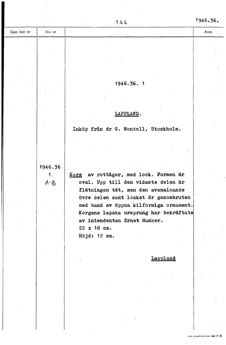 • 144 1946.36. 1946.36. 1 LAPPLAND. Inköp från dr G. Montell, Stockholm. Korg av rottågor, med lock. Formen är oval. Upp till den vidaste delen är flätningen tät, men den avsmalnande övre delen samt loc... Visa hela