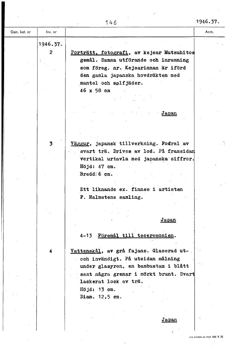 146 1946.37. 1.946.37". 2 Porträtt, fotografi, av kejsar Mutsuhito gemål. Samma utförande och inramning som föreg. nr. Kejsarinnan är iförd den gaffila japanska hovdräkten' med mantel och solfjäder. 46 x 58 cm Jaan 3 Väggur, japansk tillverkning. Fodral av svart trä. Drives av lod. På framsid Vertikal urtavla med japanska siffror. Höjd: 47 cm. Bredd:6 cm. Ett liknande ex. finnes i artisten F. Malmstens samling. Japan 4-13 Föremål till teceremonien. 4 Vattenskål, av grå fajans. Glaserad ut- och invändigt. På utsidan målning under glasyren, en bambustam i blått samt några grenar i mörkt brunt. Svar lackerat lock av trä. Höjd: 13 cm. Diam. 12,5 em. Japan [ocr]Stäng