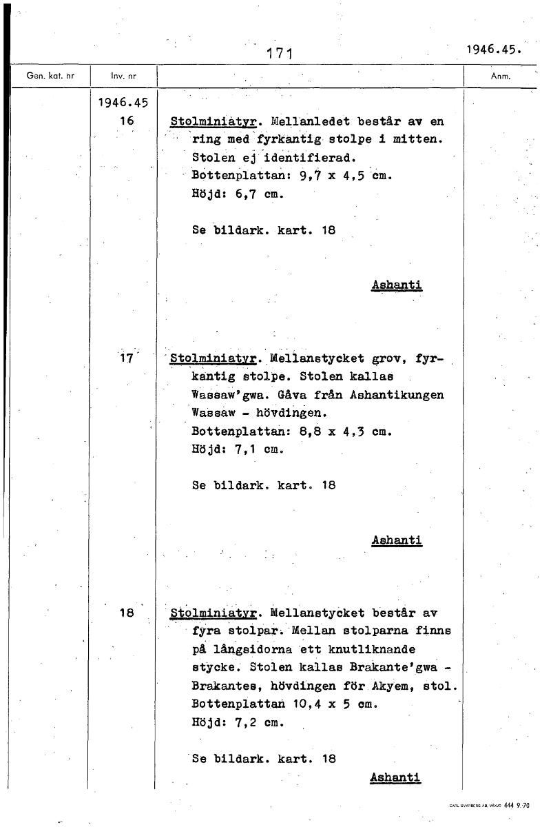1 171 1946.45. 1946.45 16 Stolminiatyr. Mellanledet består av en ring medfyrkantig.stolpe i mitten. Stolen ej identifierad. BOttenPlattan: 9,7 x 4,5 cm. Höjd: 6,7 cm. Se bildark. kart. 18 Ashanti 17 Stolminiatyr. Mellanstycket grov, fyr- kantig stolpe. Stolen kallas Wassaw'gwa. Gåva från Ashantikungen Wassaw - hövdingen. Bottenplattan: 8,8 x 4,3 cm. Höjd; 7,1 cm. bildark. kart. 18 Ashanti 18 Stolminiatyr. Mellanstycket består av fyra stolpar. Mellan stolparna finns på långsidorna ett knutliknande stycke. Stolen kallas Brakante'gwa - Brakantes, hövdingen för Akyem, stol. Bottenplattan 10,4 x 5 cm. Höjd: 7,2 cm. bildark. kart. 18 Ashanti [ocr]