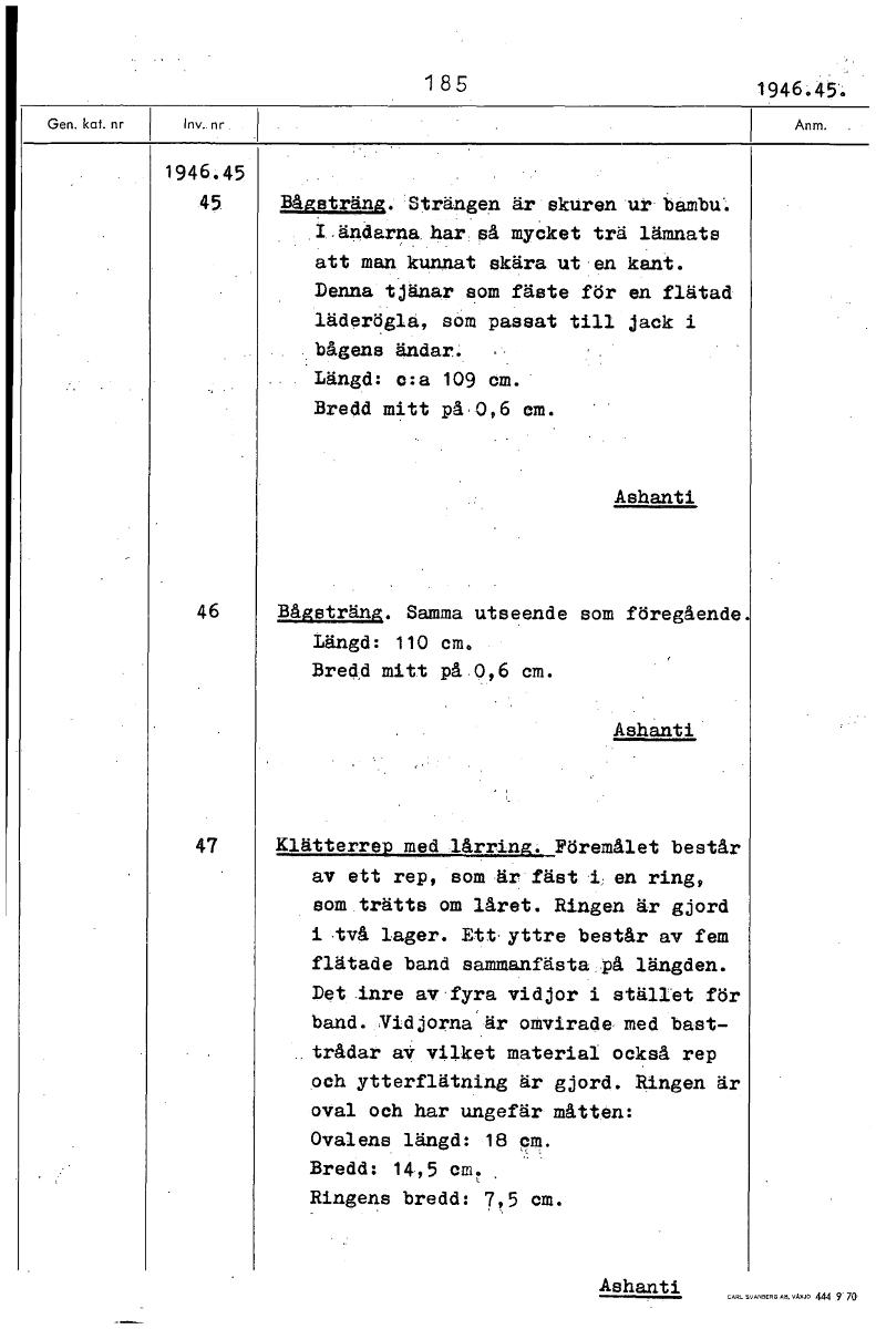 185 1946.45. 1946.45 45 Bågsträng. Strängen är skuren ur bambu i.ändarna har, så mycket trä lämnats att man kunnat skära ut en kant. Denna tjänar som fäste för en flätad läderögla, som passat till jack i bågens ändar. Längd: c:a 109 cm. Bredd mitt på,0,6 em. Ashanti 46 Bågsträng. Samma utseende som föregående. Längd: 110 cm, Bredd mitt på 0,6 cm. Ashanti 47 Klätterrep med lårring. Föremålet består av ett rep, som är fäst i en ring, som trätts om låret. Ringen är gjord i två lager. Ett yttre består av fem flätade band sammanfästa på längden. Det inre av fyra vidjor i stället för band. Vidjorna är omvirade med bast- trådar av vilket material också rep och ytterflätning är gjord. Ringen är oval och har ungefär måtten: Ovalens längd: 18 cm. Bredd: 14,5 cm. Ringens bredd: 7,5 cm. Ashanti [ocr]
