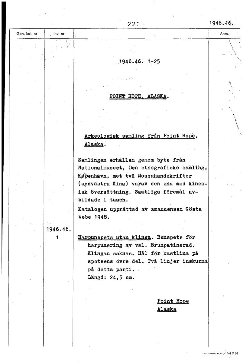 220 1946.46. 1946.46. 1-25 POINTHOPE, ALASKA. Arkeologisk samling från Point Hope, Alaska. Samlingen erhållen genom byte från Nationalmuseet, Den etnografiske samling, Köpenhamn, mot två .mossuhandskr...