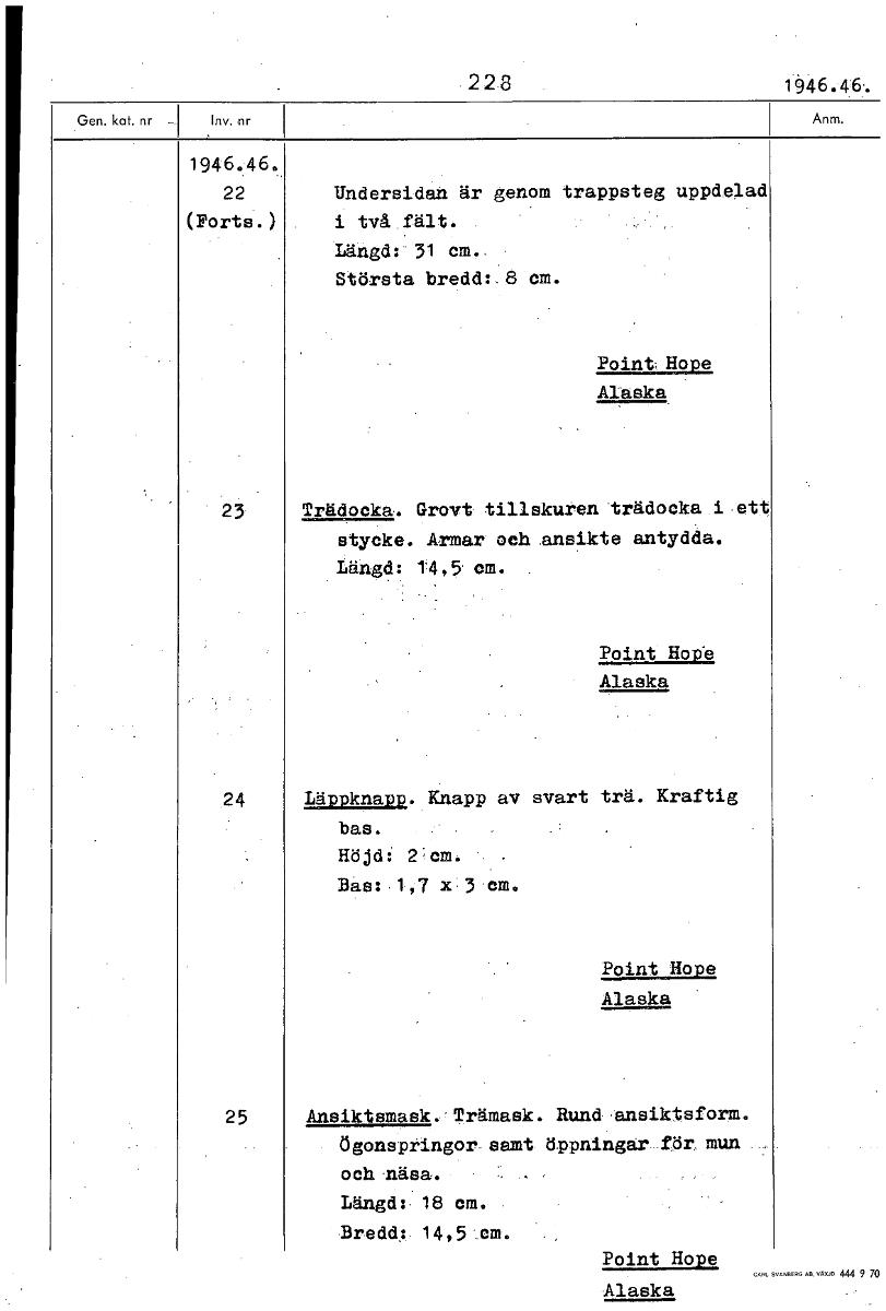 2 2 8 1946.46,. 1946.46. 22 Undersidan är genom trappsteg uppdelad (Forts.) i tvåfält. Längd: 31 cm. Största bredd: .8 cm. Point. Hope Alaska 23 Trädocka. Grovt tillskuren trädocka i ett stycke. Armar...Visa hela