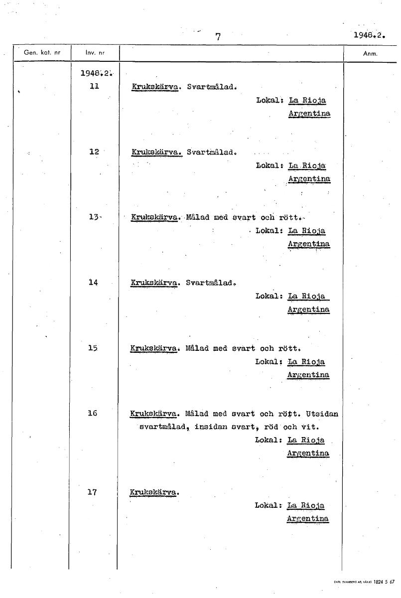 7 1946.2. 1948;2; 11 Krukskärva. Svartmålad. Lokal: La Rioja AWAAtkIla 12 Krukskärva. Svarticålad. Lokal: La Rioja Irzentina 13- Krukskärva.. ;talad med svart och rött. . Lokal: La Rioja 4pntina 14 Kr...Visa hela