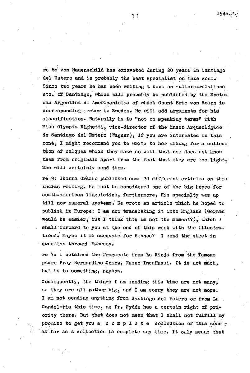 11 19442.. re 8: von Hauenschild has excavated during 20 years in Santiago del Ester° and is probably the best specialist on this zone. Since two years he has been writing a book on eulture-relatione etc. of Santiagsh which will probably be published by the Socie- dad Argentina de Americanletae of which Count Eric von Rosen is corresponding member in Sweden. He will add arguments for his claesification. Naturally be le "not on speaking terms" with Mise Olympia Righetti,' vice-dlrector of the Muaeo Arqueol6glco de Santiago del •Estero (Wagner) If you are intereeted in this zone, I night recommend you to write to her asking for a collec- ton of calques which they make so well that one does not know them from originals apart from the fatt that they are too light, She vill certainly send them. re Ibarma Grass° published some 20 different articlee on this indian writing. Be nuet be coneidered one of the big häpen for south-american linguistice, furthermore. His specialty was up till now numeral systems. He wrote an article which he hoped to Publish in Europe: I am now translating it into English (German would be easier, but I think this is not the moment?), which I shall'forward to you at the end of this week with the illustra- tions. Maybe it is adequate. for Ethnos? I send the sheet in euestion through Embaesy. re 7: 1 obtained the fragments from La Rioja from the famous padre Pray Bernardino Gomez, Musee IncaHuaoi. It is not m;Uch, but it is something, anyhow. Consequently, the things I am sending this time are not manY:: as they are all rather bie, and 1 am sorry they are not more. am not eending anything from Santiago del Estero or from La Candelaria this time, as Dr* Rydén has a certain right of pri- ority there. But that does not mean that I shall not fulfill my promise to get you a c o m p 1 e t e collection of this zäne as far as a collection Is complete any time. It only means that [ocr]