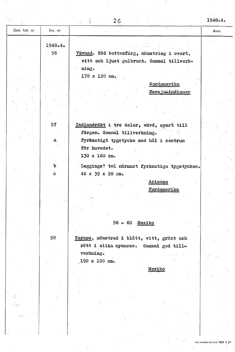 26 1948.40 1948.4 56 Vävaad. Röd bottenfärg, mönstring i svart, vitt och ljust gulbrunt. Gammal tillverk- ning, 170 x 120 em., Nordamerika Navalo4indianer 57 Indiandräkt i tre delar, vävd, gyart till färgen. Gammal tillverkning. Fyrkantigt tygstycke med hål i centrum för huvudet. 130 x 160 cm. Leggings? två närmast fyrkantiga tygstycken. 46 x 39 x 28 cm. Arizona Nordamerika 58 60 Mexiko 58 Sarape, mönstrad i blått, vitt, grönt och rött i olika nyanser. Gammal god verkning. 190 x 100 cm. Mexikö [ocr]