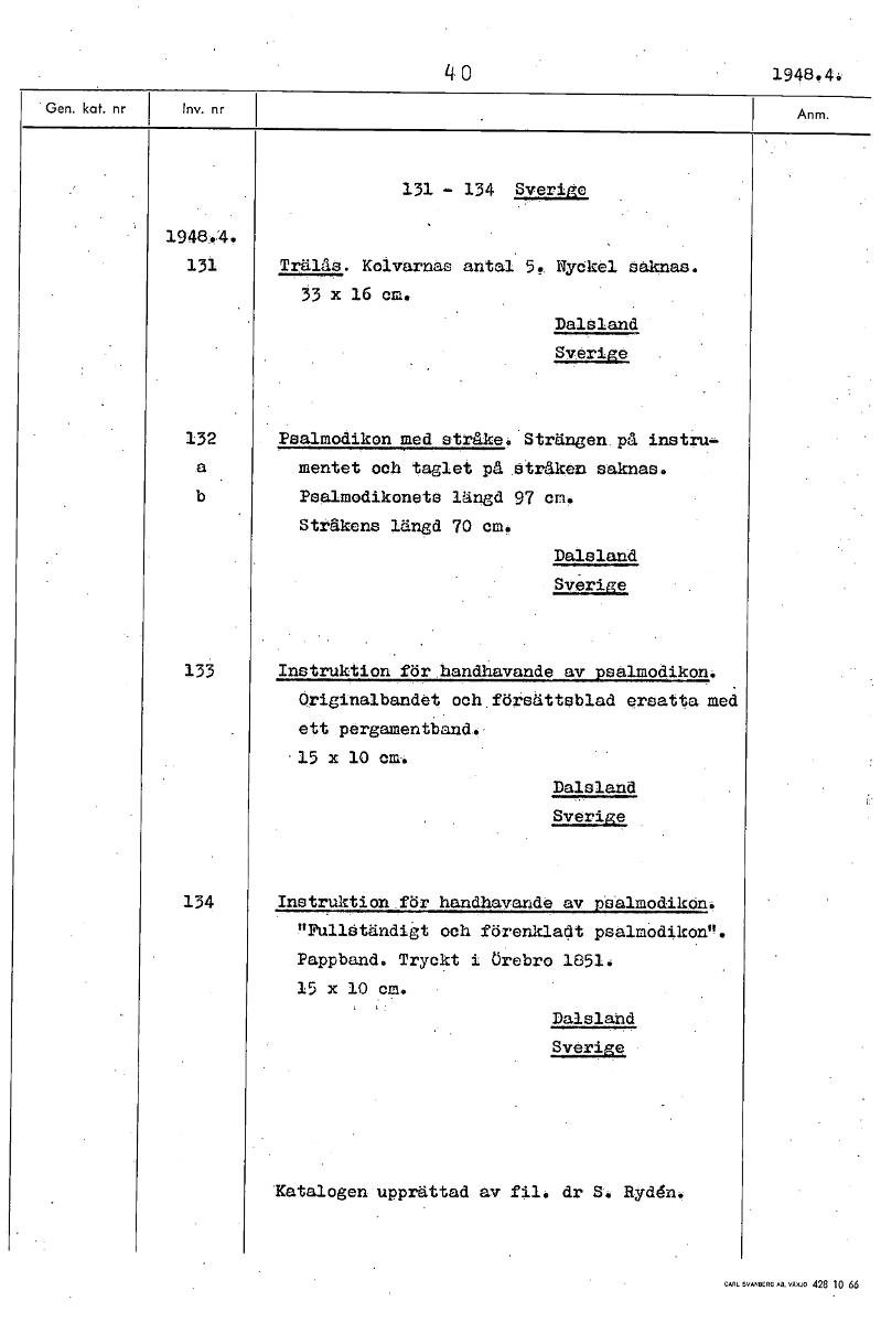 4 0 1948.4. 131 - 134 Sverige 1948.4. 131 Trälås. Kolvarnas antal 5. Nyckel saknas. 33 x 16 cm. Dalsland Sverige 132 Psalmodikon med stråke. Strängenpå ins ru•, a mentet och taglet på Stråken saknas. ...Visa hela