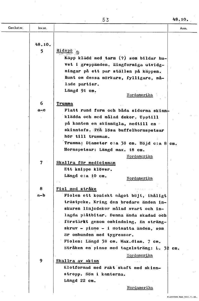 5 3 48.10. 5 Ridspö Käpp klädd med tarm (?) som bildar hu- vet i greppänden. Ringformiga utvidg- ningar på ett par ställen på käppen. Runt om dessa mörkare, fylligare, må- lade partier. Längd 91 cm. Nordamerika 6 Trumma a73 Platt rund form och båda sidorna skinn klädda och med målad dekor. Upptill på kanten en skinnögla, nedtill en skinntofs. Ty4 lösa buffelhornspetsar hör till trumman. Trumma: Diameter c:a 38 em. Höjd c:a 8 cm. Hornspetsar: Längd max. 18 cm. Nordamerika Skallra för medicinman Ett knippe klöver. Längd c:a 10 cm. Nordamerika 8 Fiol med stråke a-b Fiolen ett koniskt något böjt, ihåligt trästycke. Kring den bredare änden in- skuren linjedekor målad svart och in- lagda plåtbitar. Denna ända skadad och förstärkt genom ombindning. En sträng- skruv - pinne - i motsatta änden, som är ombunden med tygremsor. Fiolen: Längd 38 cm. Max.diam. 7 cm. Stråken en pinne med tagelsträng: L. cm. Nordamerika 9 Skallra av skinn Klotformad med rakt skaft med skinn- stropp. Söm i kanterna. Längd 22 cm. Nordamerika [ocr]Stäng