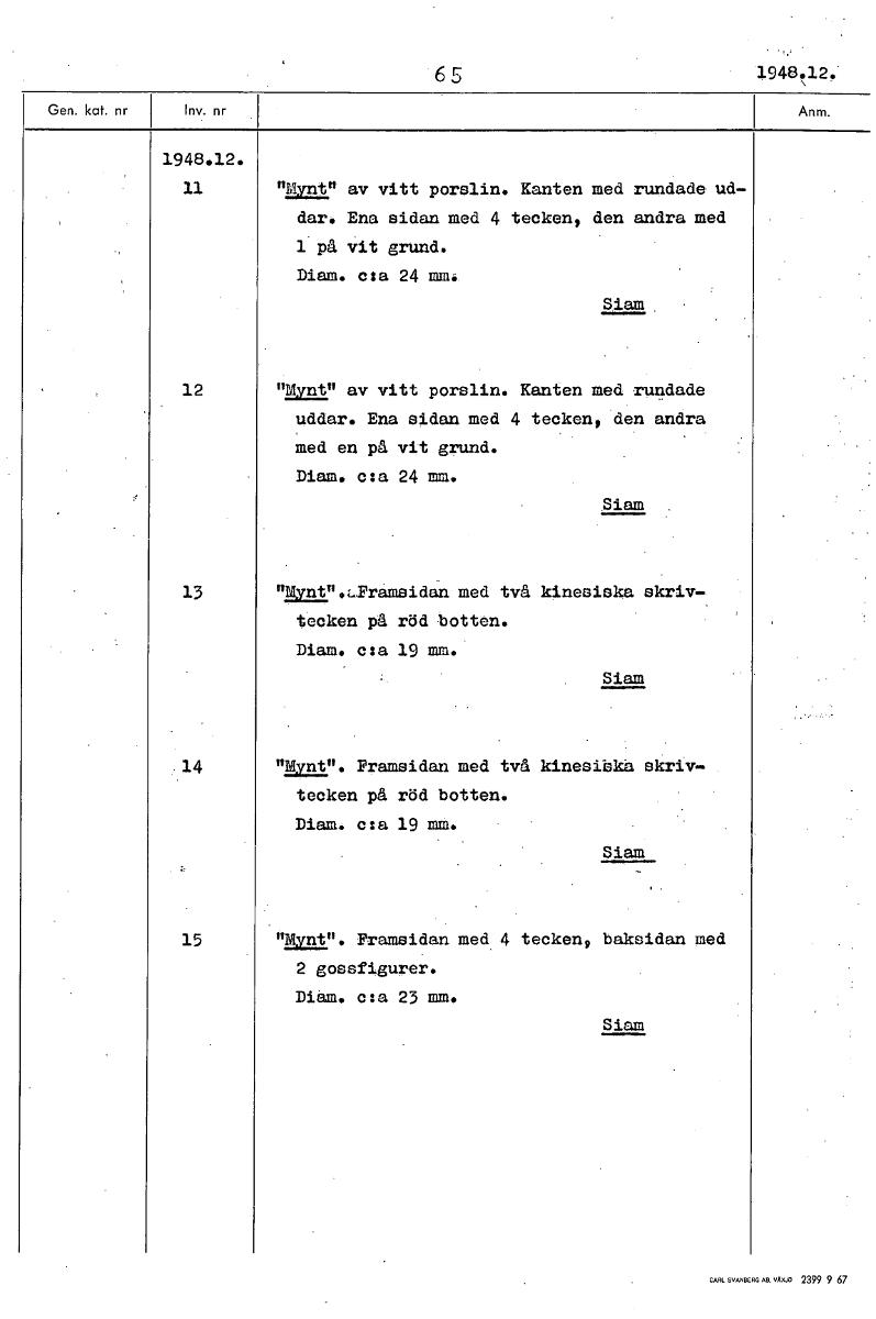 6 5 1948.12. 1948.12. 11 tur' av vitt porslin. Kanten med rundade ud- dar. Ena sidan med 4 tecken, den andra med 1 på vit grund. Diam. c:a 24 mm. Siam 12 "Mynt" av vitt porslin. Kanten med rundade uddar. Ena sidan med 4 tecken, den andra Med en på vit grund. Diam. c:a 24 mm. Siam 13 "Mynt".L.Framsidan med två kinesiska skriv- tecken på rödbotten. Diam. c:a 19 mm. Siam 14 "Mynt". Framsidan med två kinesiska skriv- tecken på röd botten. Diam. c:a 19 mm. Siam 15 "Mynt". Framsidan med 4 tecken, baksidan med 2 gossfigurer. Diam. c:a 23 mm. Siam [ocr]Stäng
