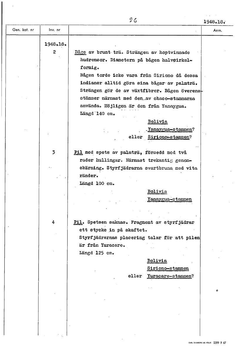 1948.18: 1948.18. 2 Båg7e av brunt trä. Strängen av hoptvinnade hudremsor. Diametern på bågen halvcirkel.. formig. Bågen torde icke vara från Siriono då dessa indianer alltid göra sina bågar.av palmträ. Strängen gör de av växtfibrer. Bågen överens stgmmer närmast med den_av chaco-stammarna använda. Möjligen är den från Yanaygua. Längd-140 cm. Bolivia ,Yanaygua-stammen? eller Sirionof.stammen? 3 Pil med spets av palmträ, försedd med två rader hullingar. Närmast trekantig genom- skärning. Styrfjädrarna svartbruna med vita ränder. Längd 100 cm. Bolivia Yanaygua-s tamren 4 Pil. Spetsen saknas. Fragment av styrfjädrar ett stycke in på skaftet. Styrfjädrarnas placering talar för att pilen är från Yuracare. Längd 125 cm. Bolivia Siriono-stammen eller Yuracare-stammen? [ocr]Stäng
