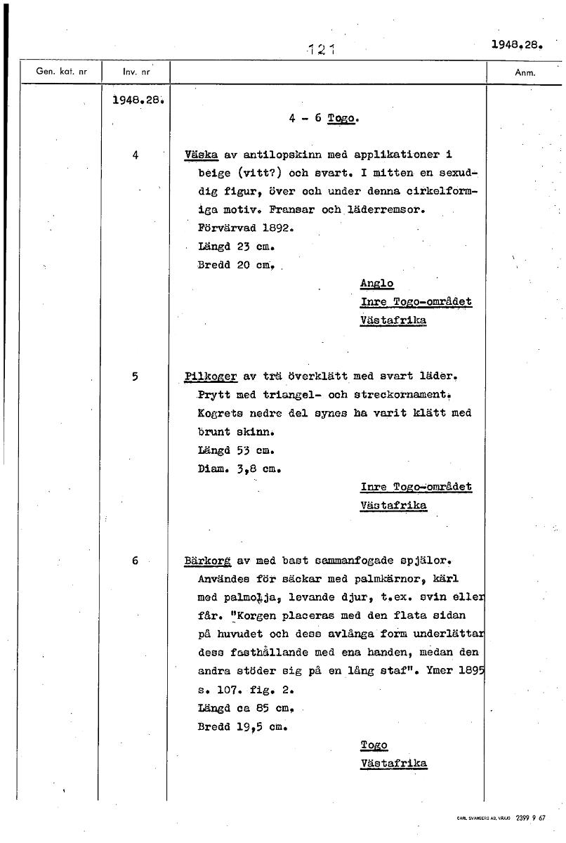 1948.28. 1948.28. 4 — Togo. 4 Väska av antilopskinn med applikationer i beige (vitt?) Och evart. I mitten, en sexud,.. dig figur, över och under denna eirkelfOrm,- iga motiv. Fransar ockläderremsor. Förvärvad 1892. Längd 23 cm. Bredd 20 cm. Anglo, Inre Togo—området Västafrika 5 Pilkoger av trä överklätt med svart läder. Prytt med triangel— och streckornament. Kogrets nedre del synes ha varit klätt med brunt skinn. Längd 53 cm. Diam. 3,8 cm. Inre Togo-området Västafrika 6 Bärkorg av med bast sammanfogade spjälor. Användes för säckar med palmkärnor, kärl med palmojda, levande djur, t.ex. svin elle får. "Korgen placeras med den flata sidan på huvudet och dess avlånga form underlätt dess fasthållande med ena handen, medan den andra stöder sig på en lång staf". Ymer 189 s. 107. fig. 2. Längd ca 85 cm. Bredd 19,5 cm. Togo Västafrika [ocr]