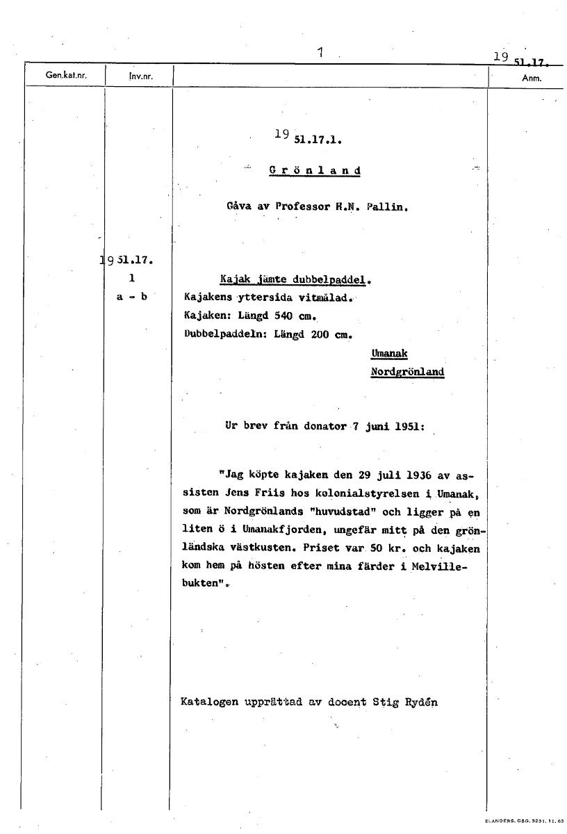 1 19 si 17 Gen.kat.nr. Invmr. Anm. 19 51.17.1. Grönland Gåva av Professor N.N. Pallin. 1 Kajak jämte dubbelpaddel. Kajakens yttersida vitmålad. Kajaken: Längd 540 cm. Dubbelpaddeln: Längd 200 cm. Uman...Visa hela