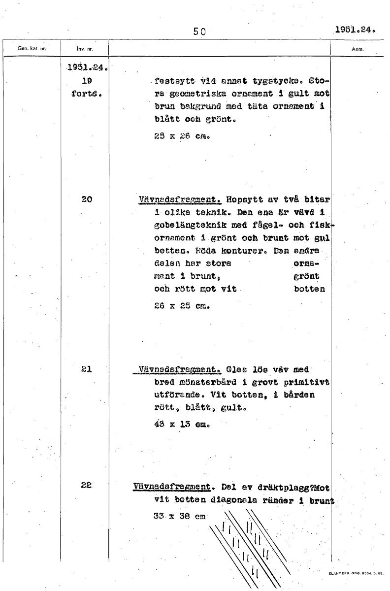 50 1951.24. 1951w 4.i 19 festsytt vid annat tygstycke. Sto- forte. ra geometriska ornament i gult mot brun bakgrund med täta ornament 1 blått och grönt. 25 x 26 Cin. 20 lirjyadefeent. Hopsytt av två bitar i olika teknik. Den ena är vävd I gobelängteknik med fågel- och fisk ornament i grönt och brunt mot gul botten. Röda konturer. Den andra delen her stora orne- ment i brunt, grönt och rött mot vit botten 26 x 25 cm. 21 Vävnedsfreament. Gles lös väv med bred mönsterbård i grovt primitivt utförande. Vit bott,n, i bården rött, blått, gult. 43 x 13 cm. 22, Vävnedsfregment. Del av dräktplageMot vit botten diagonala ränder i brun 33.x 38 em [ocr]Stäng