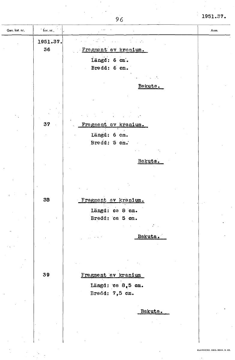 • 96 1951.37. 1„ 1951.37. 36 Fragment:av kPanium. tänjd': 6 cm. Bredd: 6 cm. Bakuta. 37 Fragment av kranium. Längd: 6 cm. Bredd: 5 cm. Bakuta. 38 Fragment av kranium. Längd: ca 8 'cm. Bredd: ta 5 cm. Ba... Visa hela