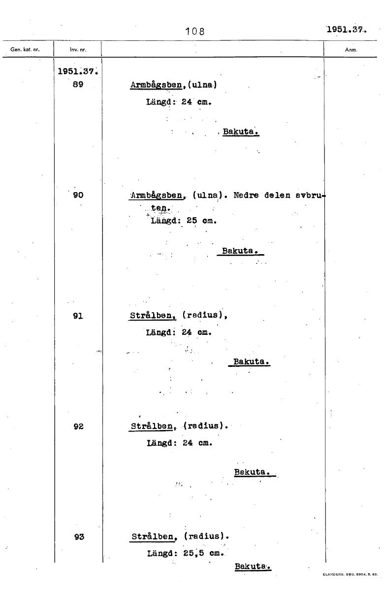 108 1951..37. 1951.37. 89 Armbågsben, (ulna.) Längd: 24 cm. Bakuta'. 90 Armbågsben, (ulna). Nedre delen avbru- ten. Lähgd: 25 om. Bakuta. 91 Strålben (radius)› Längd: 24 om. Bakuta. 92 Strålben, (radius). Längd: 24 cm. Bakuta. 93 Strålben, (radius). Längd: 25,5 cm. Bakuta-. [ocr]