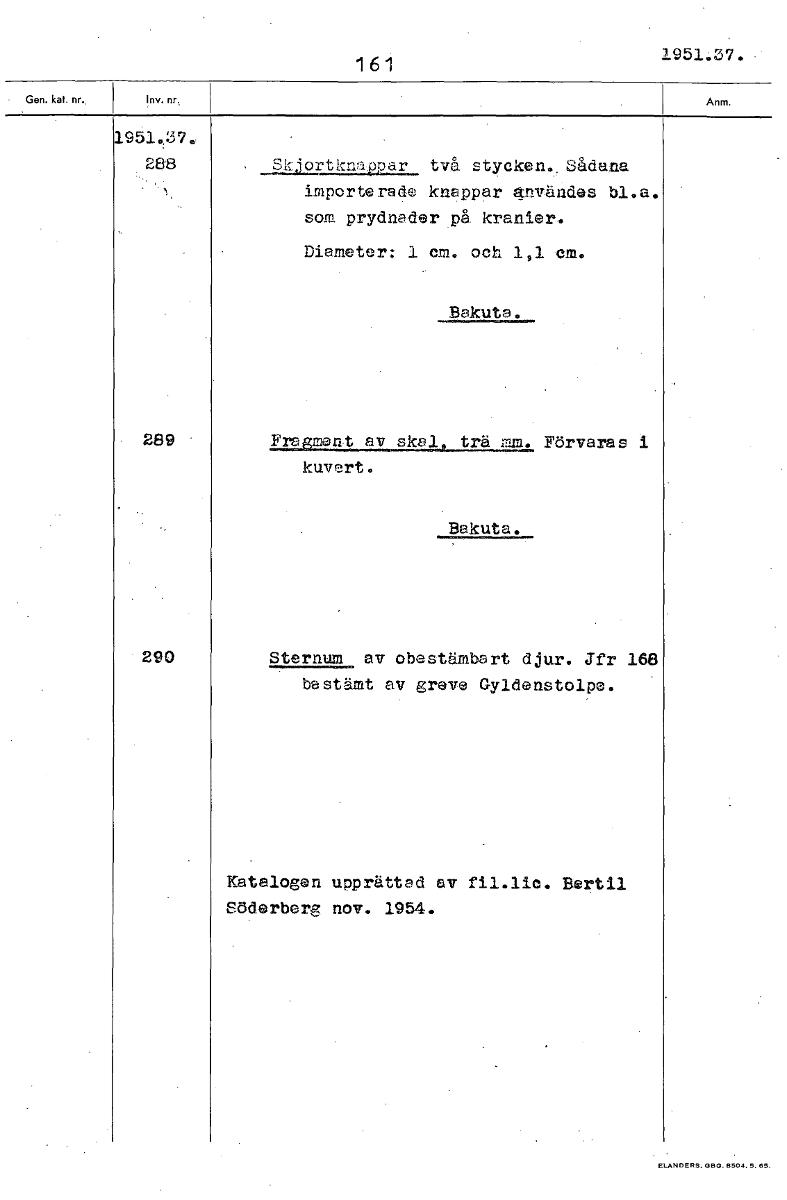 • 161 1951.37. • • 195107. 288 2.151o.r152.22,11r två stycken. Sådana importerade knappar användes bl.a. som prydnader på kranier. Diameter: 1 cm. och 1,1 cm. Bakuta. 289 Fragment av skal:, trä mm. Förv... Visa hela