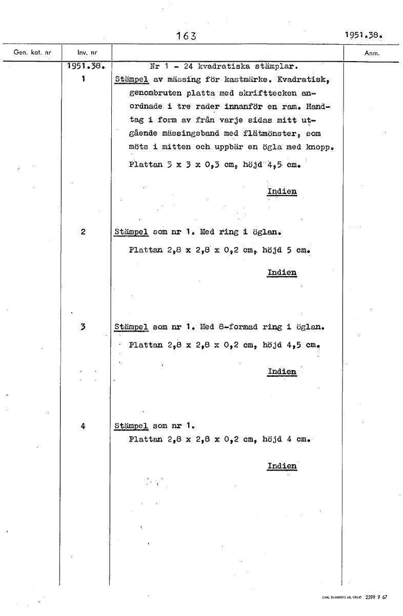 163 1951.38. 1951.38. Nr 1 - 24 kvadratiska stämplar. 1 Stäng av mässing för kastmärke. Kvadratisk9 genombruten platta med skrifttecken an- ordnade .i tre rader innanför en ram. Hand- tag i form av från varje sidas mitt ut- gående mässingsband med flätmönster9 som möts i mitten och uppbär en ögla med knopp, Plattan 3 x 3 x 093 cm9 höjd 4$5 cm. Indien 2 Stämpel som nr 1. Med ring i öglan. Plattan 298 x 298'x 092 C1/4 höjd 5 c4. Indien 3 252E21 som nr 1. Med 8.-formad ring i öglan. Plattan 298 x 298 x 092 ömt höjd 4,5 cm. Indien 4 Stämpel som nr 1. Plattan 298 x 298 x 092 cm9 höjd 4 om.• Indien [ocr]Stäng