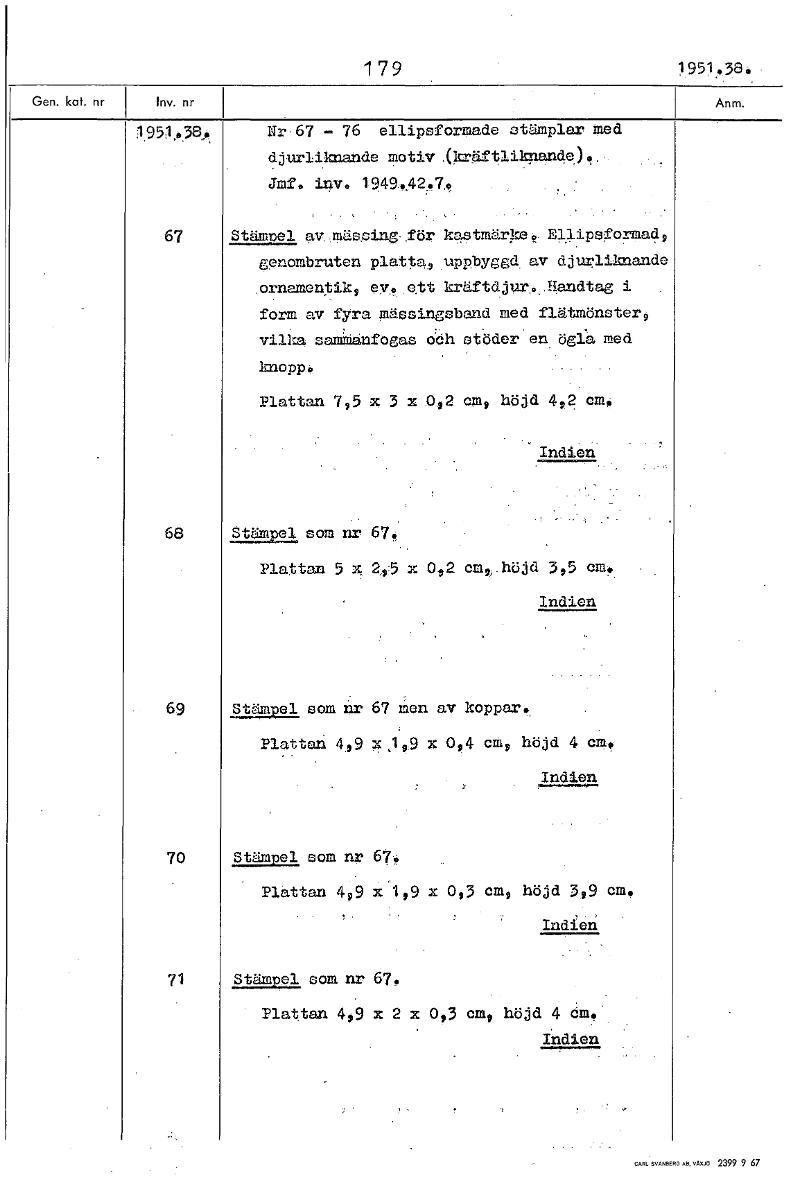 179 1951.38. 1 951 Nr 67 - 76 ellipaformade stämplar med djurliknande motiv Dräftlikpande),. Jmf. inv. 1949.42.74 67 Stämpel av. .msing för kastmärke. Ellipsformad, genombruten platta, uppbyggd av djurliknande ornamentik, ev0 ett kräftdjur. Handtag i form av fyra mässingsband med flätmönster, vilka sam fogas och stöder en ögla med knopp. Plattan 7,5 x 3 x .0 ,2 cm, höjd 4,2 em. Indien 68 Stämpel som nr 67. Plattan 5 R 245 x 0,2 e% höjd 3,5 cm.. Indien 69 Stämpel som nr 67 13n av koppar. Plattan 4,9 x,129 x 0,4 enl, höjd 4 cm, Indien 70 Stämpel som nr 674 Plattan 499 x'1,9 x 0,3 em, höjd 329 cm, Indien 71 Stämpel som nr 67. Plattan 4,9 x 2 x 0,3 cm, höjd 4 cm, Indien [ocr]