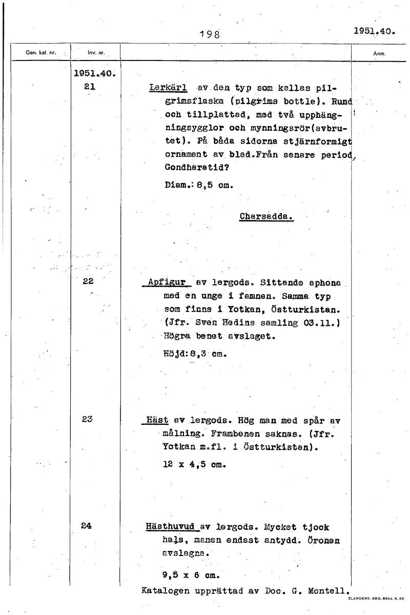 198 1951.40. 1951.40„ 21 Lerkärl av den typ som kallas pil- grimsflaska (pilgrims bott le). Run och tillplattad, med två upphäng- ningsygglor och mynningsrör(avbru- tet). På båda sidorna stjärnformig ornament av blad.Från senare perio Gondharatid? Diam.: 8 5 cm. Charsådda. 22 Apfigur av lergods. Sittande aphona med en unge i famnen. Samma typ • som finns i Yotkan, östturkistan. • (Jfr. Sven Hedins samling 03.11.) • Högra benet avslaget. Höjd:8,3 em. 23 Häst ev lergods. Hög man Med spär av målning. Frambenen saknas. (Jfr. Yotkan m.fl. i Östturkistan). 12 x 4,5 em. 24 Hästhuvud av lergods. Mycket tjock hals, manen endast antydd. öronen avslagna. 9,5 x 6 em.• Katalogen upprättad av Doc. G. Montell. [ocr]Stäng