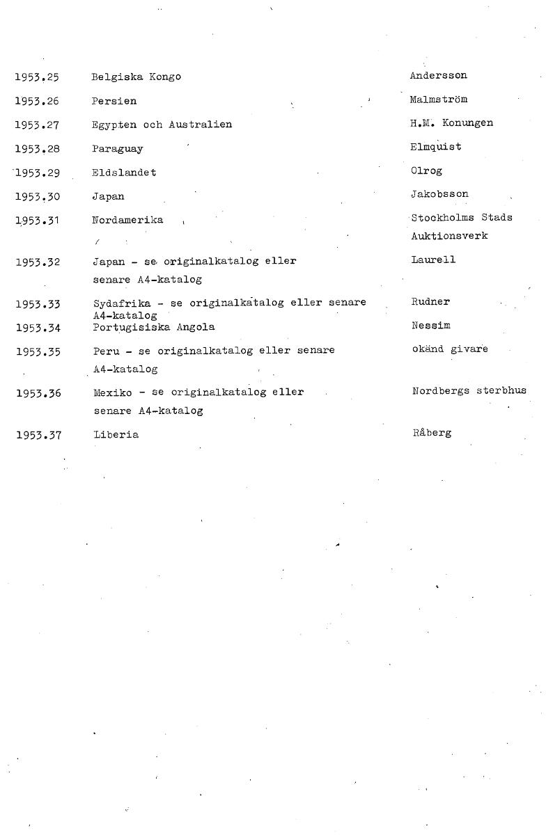 1953.25 Belgiska Kongo Andersson 1953.26 Persien Malmström 1953.27 Egypten och Australien H.M. Konungen 1953.28 Paraguay ElmqUist '1953.29 Eldslandet Olrog 1953.30 Japan Jakobsson 1953.31 Nordamerika 'Stockholms Stads Auktionsverk 1953.32 Japan - sa originalkatalog eller Laurell senare A4-katalog 1953.33 Sydafrika - se originalkatalog eller senare Rudner A4-katalog 1953.34 Portugisiska Angola Nessim 1953.35 Peru - se originalkatalog eller senare okänd givare A4-katalog 1953.36 Mexiko - se originalkatalog eller Nordbergs sterbhus senare A4-katalog 1953.37 Liberia Råberg [ocr]Stäng