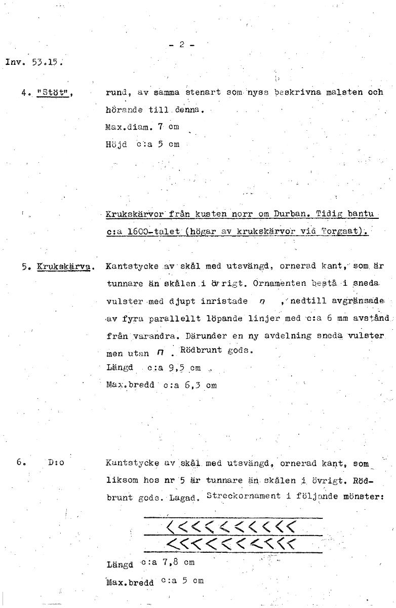 2 Inv. 53.15. 4. "Stöt", rund, av samma stenart som nyss beskrivna malsten och hörande till denna. Max.diam. 7 cm Höjd c:a 5 cm Krukskärvor från kusten norr om Durban. Tidig bantu c:a 1600-talet (högar av krukskärvor via Torgaat). 5. Krukskärva. Kantstycke av skål med utsvängd, ornerad kant som är tunnare än skålen .i arrigt. Ornamenten bestå i sneda vulster med djupt inristade n ,. nedtill avgränsade av fyra parallellt löpande linjer med 'c:a6 mm avstånd från varandra. Därunder en ny avdelning sneda vulster, men utan n . Rödbrunt gods. Längd c:a 9,5 cm Max.bredd c:a 6,3 cm 6. D:o Kuntstyäke avjkål. med utsvängd, ornerad kant, som liksom hos nr'5 är tunnare är.i skålen i. övrigt. Röd- brunt gods.-Lagad. Streckornament i följande mönster: <<“<<<<“ Längd 7,8 cm tax.bredd c:3 5 cm [ocr]