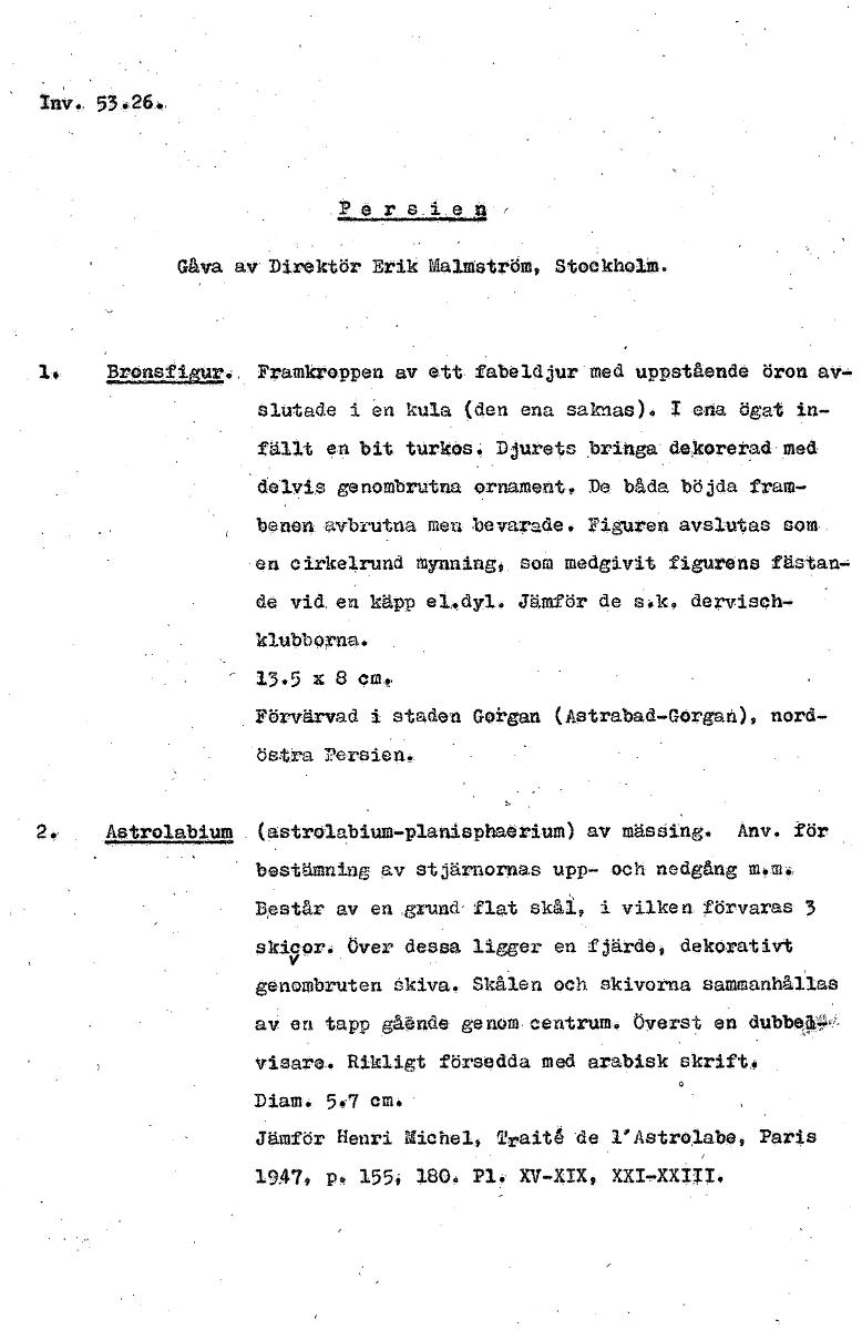 Inv- ersien Gåva av Direktör Erik Malmström, Stockholm. 1. P22,91.911e14, Framkroppen av ett fabeldjur med uppstående öron av- slutade i ån kula (den ena saknas). 1 ena ögat in- fällt en bit turkos. Djurets bringa dekorerad med delvis genombrutna ornament. De båda böjda fram- benen avbrutna men bevarade. Figuren avslutas som. en cirkelrund mynning, som medgivit figurens fästan- de vid, en käpp el.dyl. Jämför de S.k. dervisch- klubborna. 13.5 x 8 cmt Förvärvad i staden Goi-gan (Astrabad-Gorgan), nord- östra Persien. Astrolabium (astrolabium-planisphaerium) av mässing* Anv. kör bestämning av stjärnornas upp- och nedgång m.m, Består av en ,grund flat skåi, i vilken förvaras 3 skicor. över dessa ligger en fjärde, dekorativt genombruten skiva. Skålen och skivorna sammanhållas av en tapp gåönde genom centrum. överst en dubbed visare. Rikligt försedda med arabisk skrift. Diam. 5.7 em. Jämför Henri Michel, Trait6 de l'Astrolabe* Paris 1947, P. 155, 180. Pl. XV-XIX, XXI-XXITL [ocr]