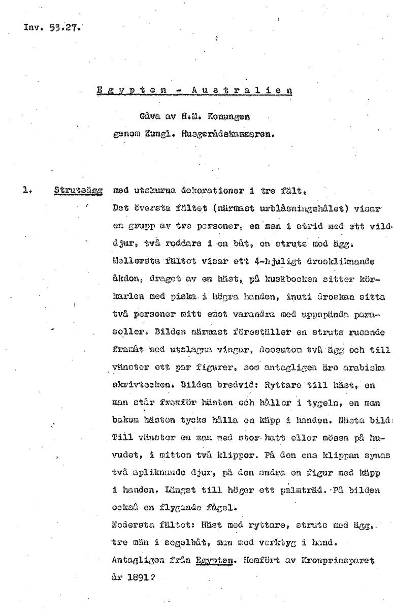 Inv. Aus ralien Gåva av H.M. Konungen genom Kungl. Husgerådskammaren. 1. rutsU mod utskurna dekorationer i tre fält. Det översta fältet (närmast urblåsningshålet) visar en Grupp av tro personer, en man i strid med ett vild. djur, två roddare i-en båt, en struts mod ägg. Mellersta fältet visar ett 4-hjuligt droskliknande åkdon, draget av en häst, på kuskbocken sitter kör- korlon mod pisk.i högra handen, inuti droskan sitta två personer mitt emot varandra med uppspända para- eolier. Bilden närmast föreställer en struts rusande framåt mod utnlaGna vingar, dessutom två gg och till vänster ett par figurer, som antagligen äro arabiska skrivtecken. Bilden bredvid: Ryttcro till häst, on man star framför häoton och håller i tyGeln, en man bakom häoton tycks hålla on käpp i handen. Nästa bild: Till vänster en man med stor hatt eller mössa på hu- vudet, i mitten två klippor. På den ena klippan synas två apliknande djur, på den andra on figur med käpp i handen. Längst till hör ett pa.imträd..På bilden också en flygande fågel. Nedersta fältet: Häst med ryGtare, struts med ägel, tre män i segelbåt, man mod verktyg i hand. Antagligen från Egypten. Homfört av Kronprinsparet år 1891? [ocr]