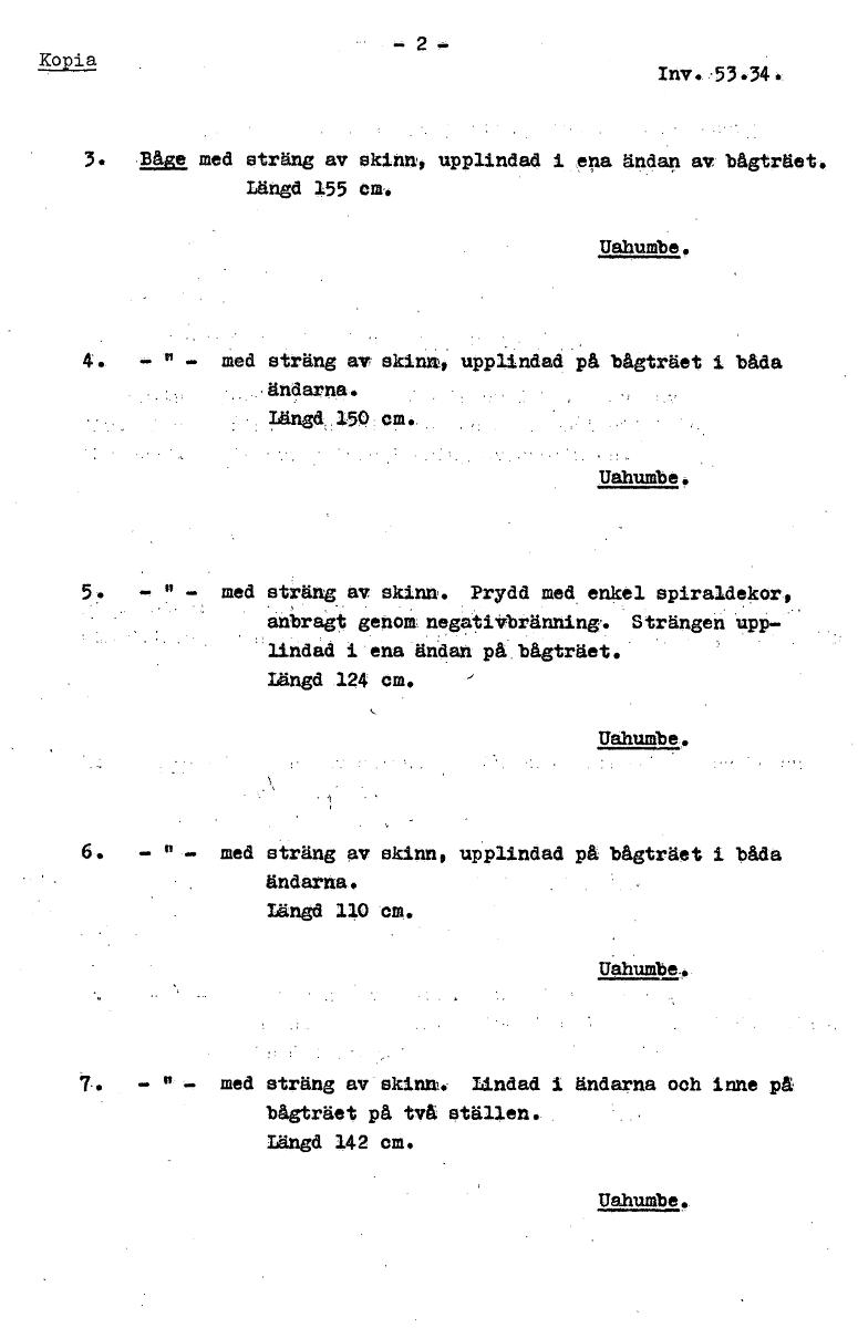 Kopia 1nv.-53 34. 3. •Båge med sträng av skinn, upplindad i,ena ändan av bågträet. Längd 155 Ca. Uahumbe, med sträng av skina, upplindad på bågträet i båda ändarria. Längd 150 cm. Uahumbe. med sträng ...